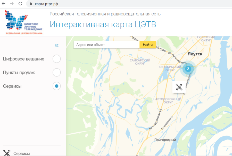 Сервисы понадобятся тем, кому нужна помощь в выборе приемного оборудования, крепеже наружной антенны, ремонте телевизора или приставки. Такие проблемы требуют специальных знаний и опыта, и не все зрители самостоятельно могут с ними справиться. Для поиска ближайшего сервисного пункта нужно открыть карту, поставить галочку в строчке “Сервисы” и найти значок “отвертка и гаечный ключ” рядом с вами. Либо, наоборот, сначала ввести название своего населенного пункта в поисковую строку и найти значок отвертки поблизости.