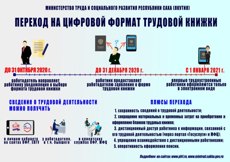С 2020 года в России в рамках реализации национального проекта «Цифровая экономика» введен электронный формат трудовых книжек. До 31 октября работодатели должны известить работников, а те до 31 декабря должны написать заявление о сохранении бумажной трудовой книжки или о ее ведении в электронном виде. Подробности сообщили в министерстве труда и социального развития Республики Саха (Якутия).